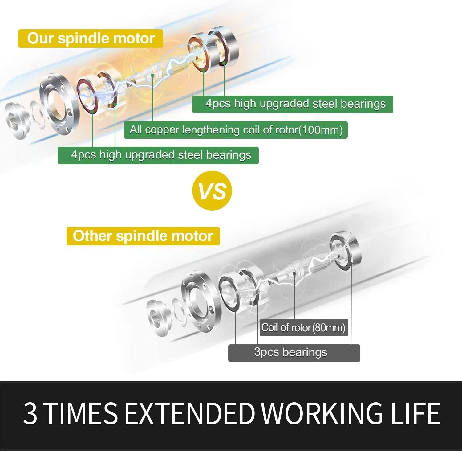 We use 4pcs upgraded of superior durability steel bearings and all copper lengthening coil of rotor for spindle motor. In normal case, the working life of our spindle motor can reach 2 years for 8 hours/day.