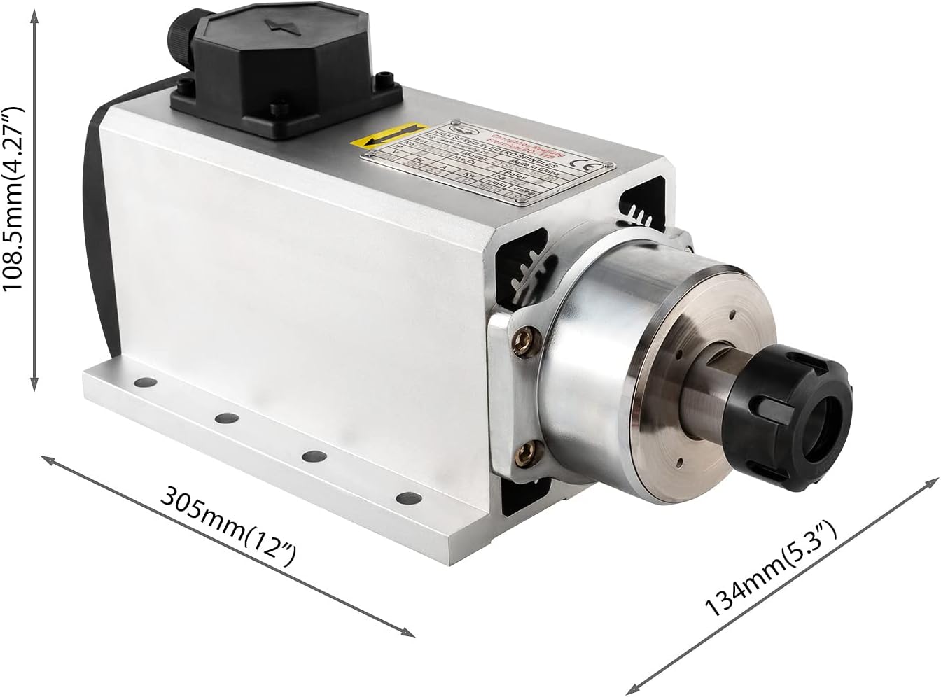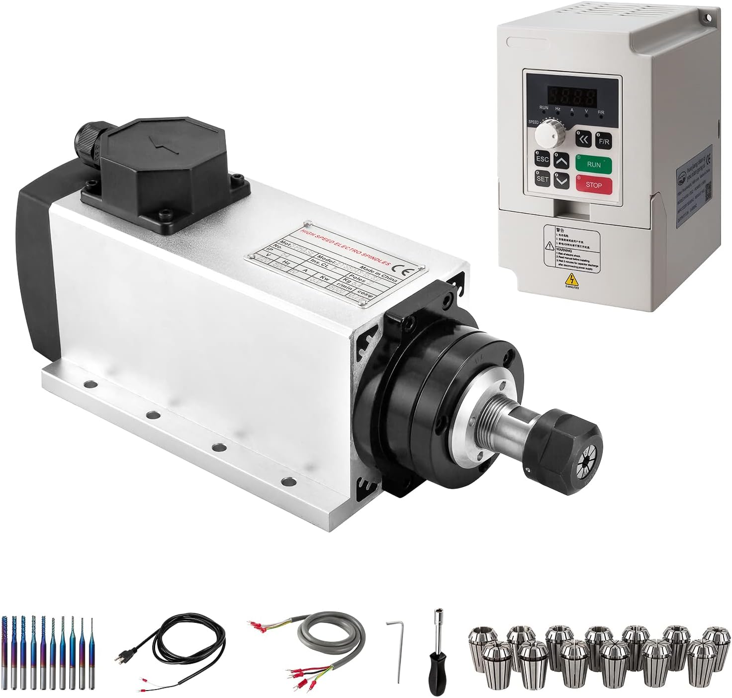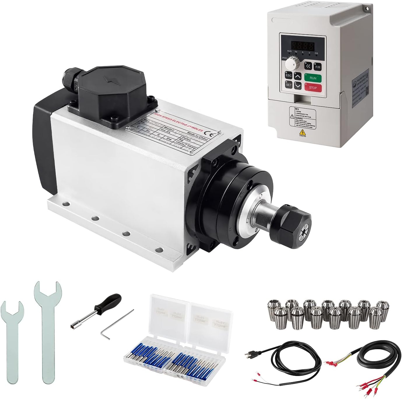 It includes aviation wire,power wire and 3 pcs wrenches to connect spindle motor to VFD. The appearance design of square spindle motor have 2 sides mounting holes to fix. It will take just 5 minutes to install all and make all functions running.